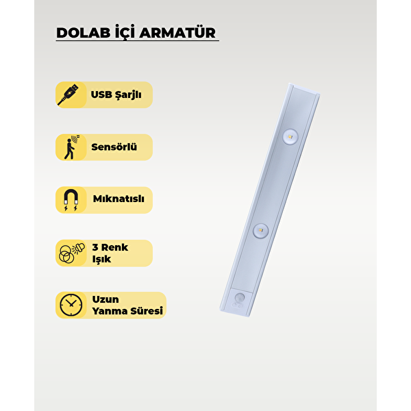 Gri sensörlü, mıknatıslı -3 işık renkli / usb şarjlı armatür, modern tasarımı ve pratik kullanımıyla dikkat çeken bir üründür. Bu armatür, beyaz, gün ışığı ve sarı ışık olmak üzere üç farklı ışık rengi seçeneği sunar, böylece ortamınıza istediğiniz atmosferi kolaylıkla yansıtabilirsiniz. Sensör özelliği sayesinde elleriniz dolu olsa bile ışığı kontrol etmenizi sağlar. Ayrıca mıknatıslı tasarımı sayesinde metal yüzeylere kolayca monte edebilir ve istediğiniz zaman çıkarabilirsiniz. Usb şarj özelliğiyle kablosuz kullanım imkanı sunar, böylece herhangi bir elektrik prizine ihtiyaç duymadan kullanabilirsiniz. Led teknolojisiyle üretilen bu armatür, enerji tasarrufu sağlarken uzun ömürlü kullanım imkanı sunar. İç mekanlarda kullanılabilen bu ürün, evinizde, ofisinizde estetik bir aydınlatma çözümü sunar. Kullanım kolaylığı, çoklu renk seçenekleri ve şık tasarımıyla modern yaşamın vazgeçilmez aydınlatma ürünlerinden biridir.