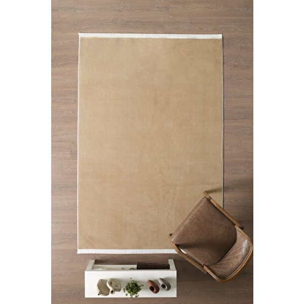 Modern Saçaklı Kaymaz Taban Tavşan Tüyü Kolay Temizlenebilir Yıkanabilir Salon Oturma Odası Yolluk Mutfak Halısı Bej Renk