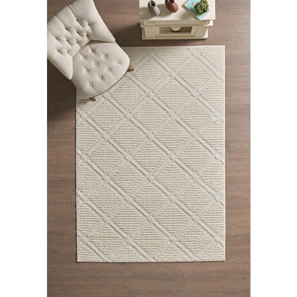 Adalizza Yumuşak Peluş Tüylü İskandinav Desenli Kabarık Bukleli Krem Renkli Halı 160x450 cm
