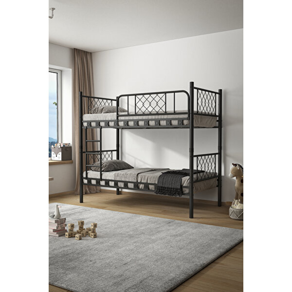 METİS RANZAGENEL•ISO 9001:2015 kalite yönetim sistemi standartlarında üretilmiştir, TSE belgelidir.; •Metis Ranza, CR-ST 12 kalitesinde 1 mm kalınlığında metal profillerden üretilmektedir.; •Ürün, epoksi ve polyester reçineli elektrostatik toz boyalıdır böylece aşınma, solma, paslanma yapmadan kullanılabilir.; •Ürün tamamen demontedir.; •Özel alyan vida geçme sistemi ile herhangi bir ek alet veya bağlantı sistemi kullanılmadan kolaylıkla kurulum yapılabilir.; •Alyan vida sistemi ile karyola dayanıklılığı artar; sallanma, ses, gıcırtı yapma gibi olumsuzluklar yaşanmaz.; •Ürüne 1 adet korkuluk dahildir.; •Ekstra korkuluk istenmesi durumunda; ek korkuluk için ayrıyeten sipariş verilmelidir.; •Ürün 2 yıl garantilidir.; •Ürün parçasının kaybolması, deforme olması ya da kullanıcı kaynaklı hata olması durumunda, AKSviva tarafından 10 yıl ekipman desteği sağlanmakta olup ücret karşılığında parça temin edilebilir.; TEKNİK DETAY•Yatak yerden yüksekliği 28 cm’dir.; •Yatak yuva derinliği 6 cm’dir.; Bütün yataklar için uygundur.; •Karyola için uygun yatak ölçüsü, karyola ölçüsüdür.; •Ürüne yatak dahil değildir.; •Karyola dış ölçüsü, almış olduğunuz ölçünün 10 cm fazlasıdır.; (Örnek: 90x190 cm alınan ürünün dış ölçüsü 100x200 cm’dir.; )•Taşıma kapasitesi min.; 250 kg’dır.; •Ranza yatak altı platformu olarak 10 adet alt, 10 adet üst katta toplam 20 adet profil lata demiri vardır.; •
