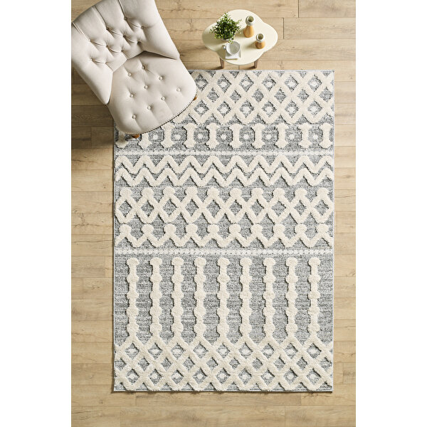 Bu modern boho tasarımı gri halı, oturma odası, salon ve yatak odası gibi farklı mekanlarda estetik ve şıklık katmak üzere özel olarak tasarlanmıştır. İşte bu halının bazı özellikleri: - **Tasarım ve Renk:** Modern boho tasarımı, mekanınıza sıcak ve modern bir hava katmak için özel olarak seçilmiştir. Gri rengi, zarif ve şık bir atmosfer oluşturur ve çeşitli dekorasyon tarzları ile uyum sağlar. - **Yumuşak Dokulu:** Bu halı, ayaklarınıza yumuşak bir dokunuş sunar, böylece oturma odası, salon veya yatak odasında rahat bir atmosfer yaratır. 18mm hav yüksekliği, konforu artırır. - **Toz Vermez:** %100 polipropilen malzeme sayesinde toz ve kir tutmaz. Bu özellik, halınızın uzun süre temiz ve bakımlı kalmasını sağlar. - **Kolay Bakım:** Toz ve kir tutmama özelliği, halının bakımını kolaylaştırır. Düzenli temizlikle halınızın ilk günkü gibi görünmesini sağlar. - **2000 gr/m² Ağırlık:** Halı, 2000 gr/m² ağırlığı ile sağlam bir zeminde durur ve kaymayı önler. Bu halı, oturma odası, salon ve yatak odası gibi farklı mekanlarda kullanım için idealdir. Modern boho tasarımı, dekorasyonunuza estetik bir dokunuş katarken, kullanım kolaylığı ve dayanıklılığı ile dikkat çeker. Estetik ve fonksiyonellik arayanlar için mükemmel bir tercihtir.