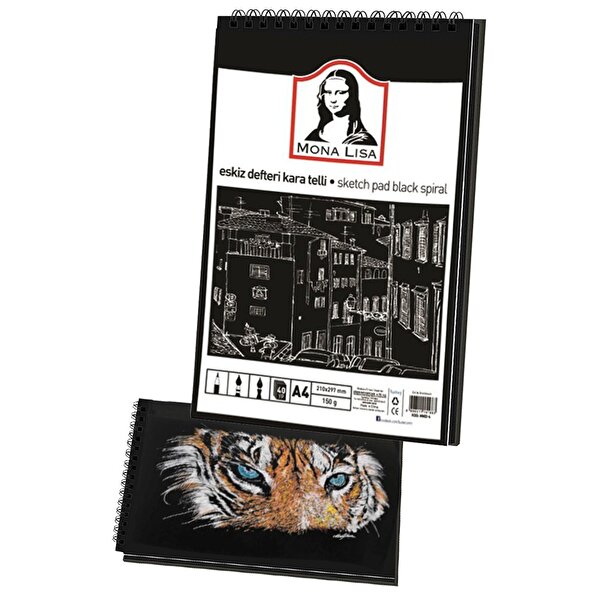 Ürün Adı: Telli Eskiz Defteri Siyah A4 1 Adet Spiralli Siyah Eskiz Defteri 150 gr 40 Yaprak Grafit Yağlı Pastel Jel Mürekkep Kalem