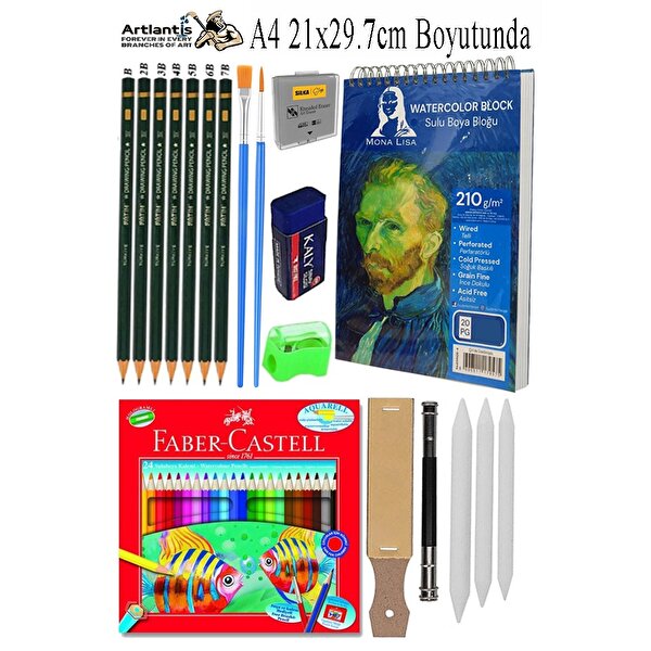 Artlantis Telli Suluboya Bloğu Kağıdı A4 210gr 20 Yaprak Dokulu Gölgelendirme Zımpara 24 Renk Aquarell Kuruboya Dereceli Uzatma