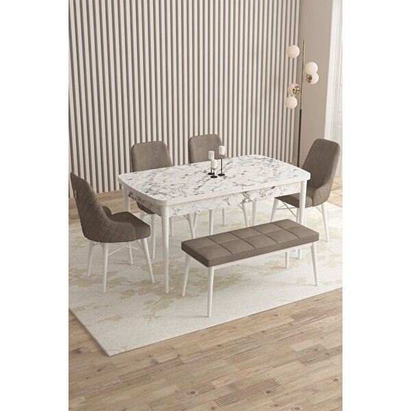 asaella mobilya Mazaka Beyaz Mermer 80x132 Açılabilir Mdf Masa Yemek Odası Takımı, Mutfak Takımı 4 Sandalye 1 Bench Cappuccino