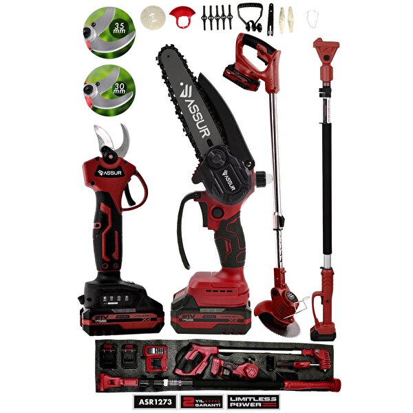 Assur 4'lü Set 21v Çift Akülü Teleskopik Dal Budama Makinesi & Şarjlı Tırpan Çim Biçme Makinesi Kırmızı