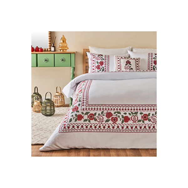 160x220 cm ebatında nakış desenli %100 Pamuk Saten Jolly Tek Kişilik Nevresim Seti. Ürün %100 Türk malı olup, %100 Pamuk 82 Tel Saten kumaştan üretilmiştir. OEKO-TEX ve BSCI sertifikalıdır. Kanserojen ve alerjen metaller içermez. Cildi tahriş etmez ve insan sağlığına zarar vermez. Sağlığımız için risk teşkil eden azoik boya kullanılmaz. 30 derecede yıkanabilir, düşük devirde sıkma yapılabilir, tamburlu makinede düşük ısıda kurutma yapılabilir , düşük ısı ayarında ütülenebilir, benzer renkler ile yıkayınız, ağartıcı kullanılmaz.Yılbaşı konseptli Jolly Koleksiyonu, bereketin ve zenginliğin sembolü nar figürleriyle yaşam alanlarınıza bolluk ve neşe taşıyor. Uzak Doğu’dan Anadolu’ya uzanan bu büyülü yolculuk, narın antik kültürlerdeki derin anlamlarıyla buluşarak, kanaviçe dokusunu dijital baskı ile modern bir estetikte sunuyor. Nevresimlerden dekoratif yastıklara, yemek takımlarından yatak örtülerine kadar geniş bir yelpazede, narın vintage ve rustik dokunuşu evlerinize sıcak ve bereketli bir atmosfer katıyor.