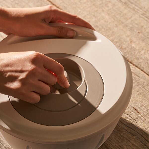 İçi ve dışı çift renk özelliğe sahip, manuel çevirme mekanizması ile ıslak gıdaların hızlıca kurutulmasını sağlayan kurutucu kasedir. Kapasitesi 4500 ml. dir. Parçalarını çıkartarak bulaşık makinesinde yıkanması uygundur. BPA içermez, gıda ile temasa uygundur.