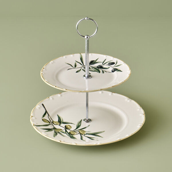 Olive koleksiyonuna ait porselen 2 katlı kurabiyelik. Olive Koleksiyonu, binlerce yıllık zeytin ağaçlarının gölgesinden ilham alarak doğallığı, sadeliği ve köklü bir kültürü sofralarınıza taşıyor. Sofradan dekorasyona uzanan her parça, toprağın bereketini ve doğayla kurulan kadim bağı hissettiriyor. Zeytin dalının huzur veren zarafetiyle şekillenen bu koleksiyon, yaşam alanlarınıza anlam ve dinginlik katıyor.