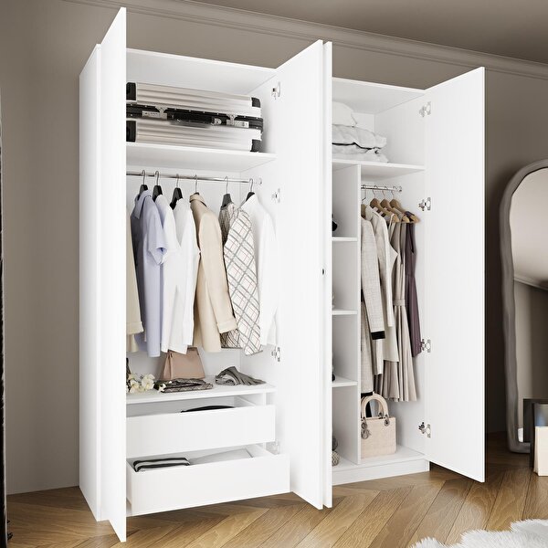 İç yapısında yer alan 2 askılı bölüm, gömlek, ceket ve elbiseler için ideal bir asma alanı sunarken; 2 yüklük bölmesi; yorgan, battaniye ve valiz gibi hacimli eşyalar için ekstra depolama sağlar. 4 raflı bölüm, katlanabilir kıyafetlerin düzenlenmesini kolaylaştırırken, 2 çekmece küçük tekstil ürünleri ve aksesuarlar için pratik kullanım sunar.