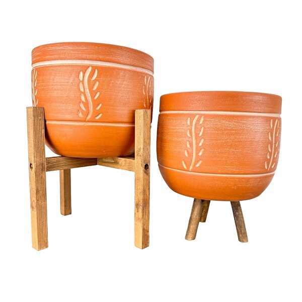 Bitki Tasarımı Doğal Nakış Desen Terrakota Toprak Saksı İkili Set 4 Ayaklı - 3 Ayaklı