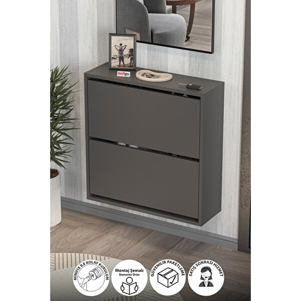 Bofigo Düşer Kapak Ayakkabılık 2 Bölmeli Kayar Raflı Ayakkabılık Duvara Monte Ayakkabılık Peri Antrasit