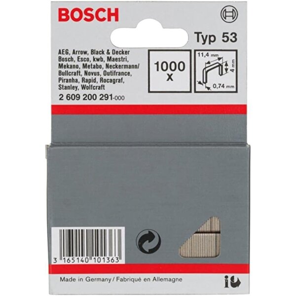 Bosch Zımba Teli Tip 53, dayanıklı yapısı ve yüksek kaliteli çelik malzemesi ile profesyonel ve ev kullanıcıları için güvenilir bir seçimdir.
