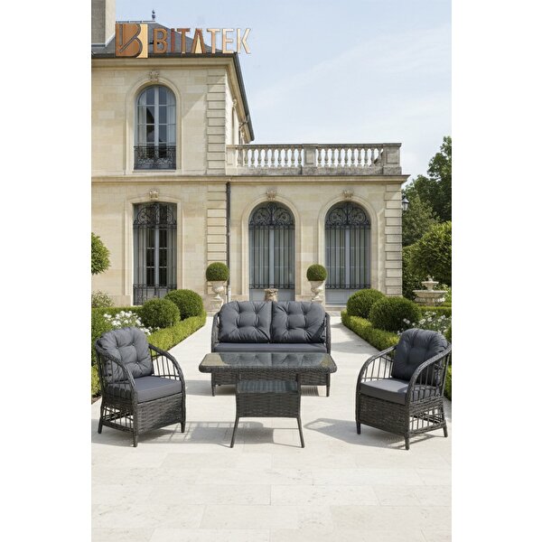 Btk Concept Açelya Rattan Bahçe Balkon Oturma Takımı 2+1+1+camlı Masa Antrasit Rengi