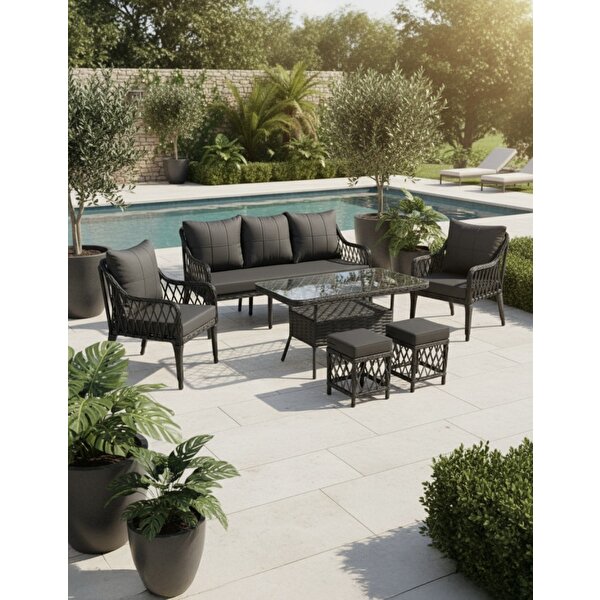 Btk Concept Milano Rattan Puflu Bahçe Balkon Takımı 3+1+1+camlı Masa Antrasit
