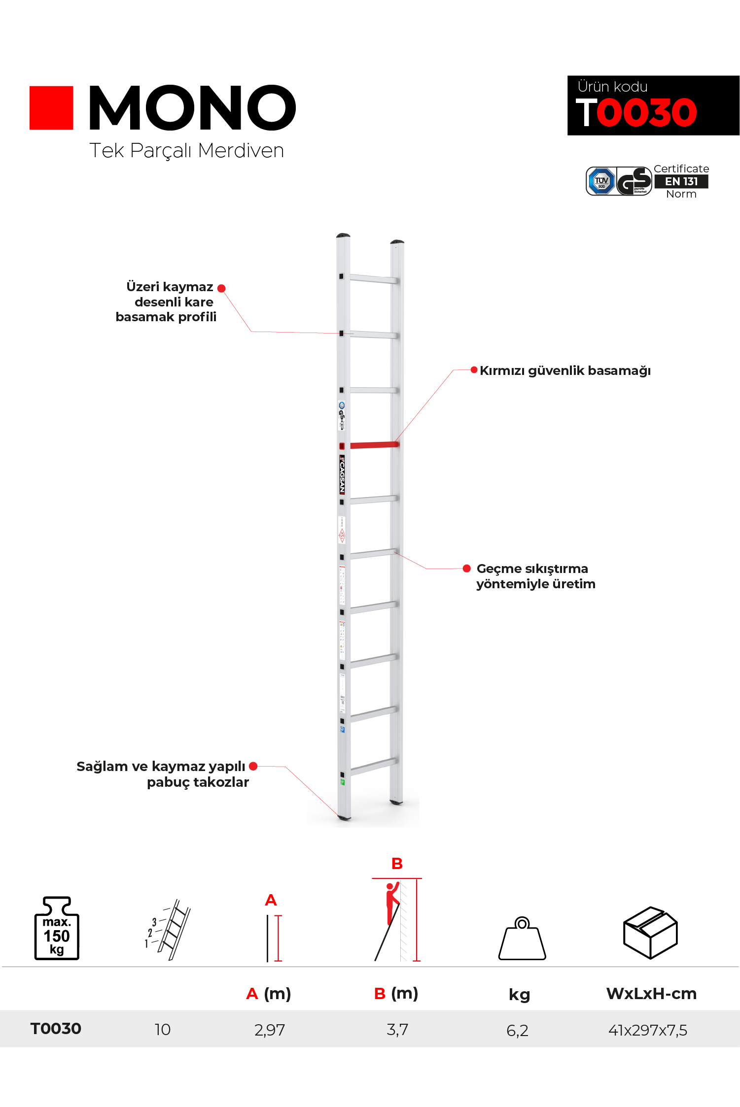 MONO Tek Parçalı Alüminyum Merdivenler, profesyonel işler ve ev kullanımı için pratik ve güvenli bir çözümdür. Hafif alüminyum yapısı sayesinde kolay taşınır, sağlam profilleri ve kaymaz basamaklarıyla uzun ömürlü kullanım sunar. Kırmızı güvenlik basamağı maksimum güvenliği işaret eder.MONO merdivenler, TÜV-SÜD ve TSE EN 131 belgeleriyle kalite ve güvence sağlar.