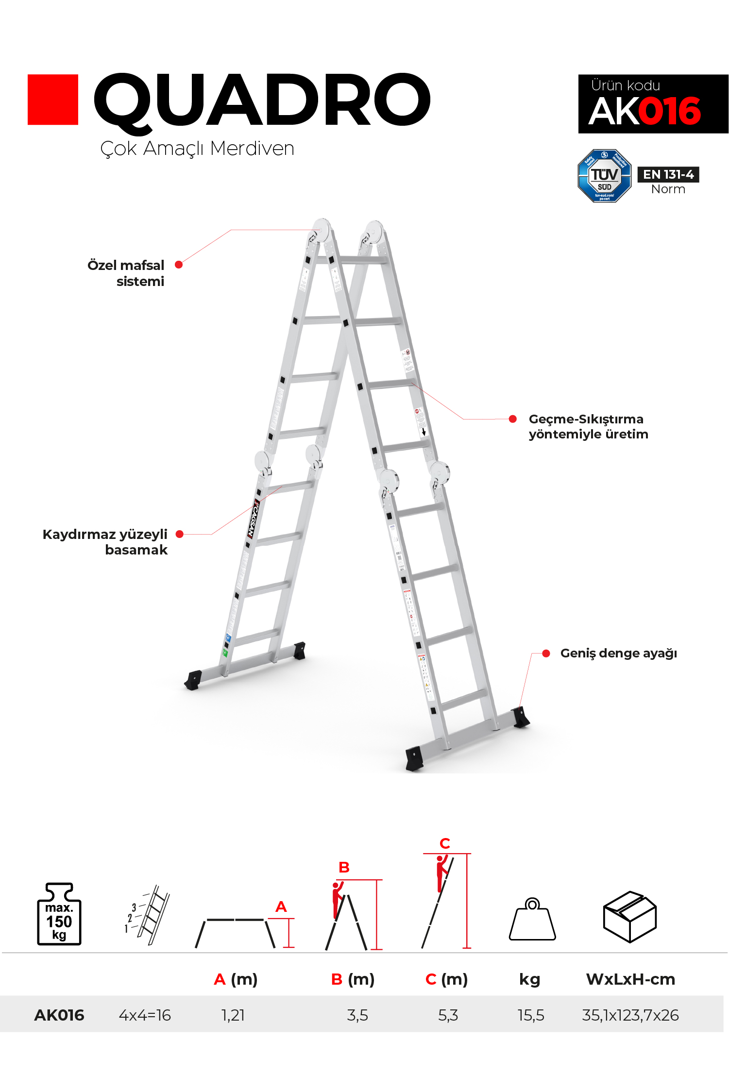QUADRO, akrobat merdiven olarak da bilinen çok fonksiyonlu yapısıyla farklı işlerde tek ürünle çözüm sunar. A konumunda çatal merdiven olarak kullanıldığında geniş bir çalışma alanına sahiptir. Düz dayamalı konumda ise birçok portatif merdivenin ulaşamadığı yüksekliklere kolayca ulaşmanızı sağlar. Farklı türevlere sahip olan bu merdivenler, çalışma alanınızda verimliliği artırırken ekipman fazlalığı sorununu da ortadan kaldırır. Hafif ve dayanıklı alüminyum gövdesi, kilitlenebilir çelik mafsalları, denge ayakları ve kaymaz pabuçlarıyla güvenli kullanım imkanı sunar. Kompakt tasarımı sayesinde araç bagajında kolayca taşınır ve depolanır. TÜV-SÜD EN 131 belgeli QUADRO, profesyonel işler ve ev kullanımı için ideal, güvenilir ve çok yönlü bir çözümdür.