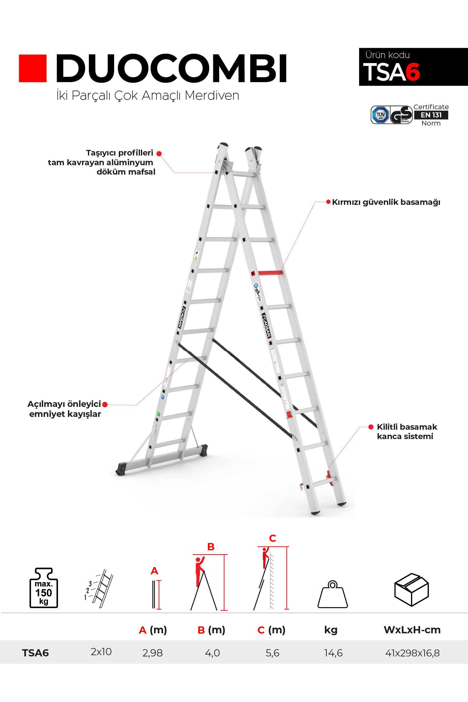 DUOCOMBI, hem duvara dayamalı hem de A tipi açılır şekilde kullanılabilen pratik bir merdivendir. Hafif alüminyum yapısı sayesinde kolay taşınır, sağlam profilleri ve kaymaz basamaklarıyla güvenli kullanım sunar. Güçlendirilmiş denge ayağı, güvenlik kayışı ve kaymaz pabuçlarıyla stabiliteyi artırır ve uzun ömürlü kullanım sağlar. TÜV-SÜD ve TSE EN 131 belgeleriyle güvenliği kanıtlanmış DUOCOMBI, profesyonel işler ve ev kullanımı için ideal çözümdür. Tek merdivenle hem yükseklik hem de kullanım esnekliği kazanın!