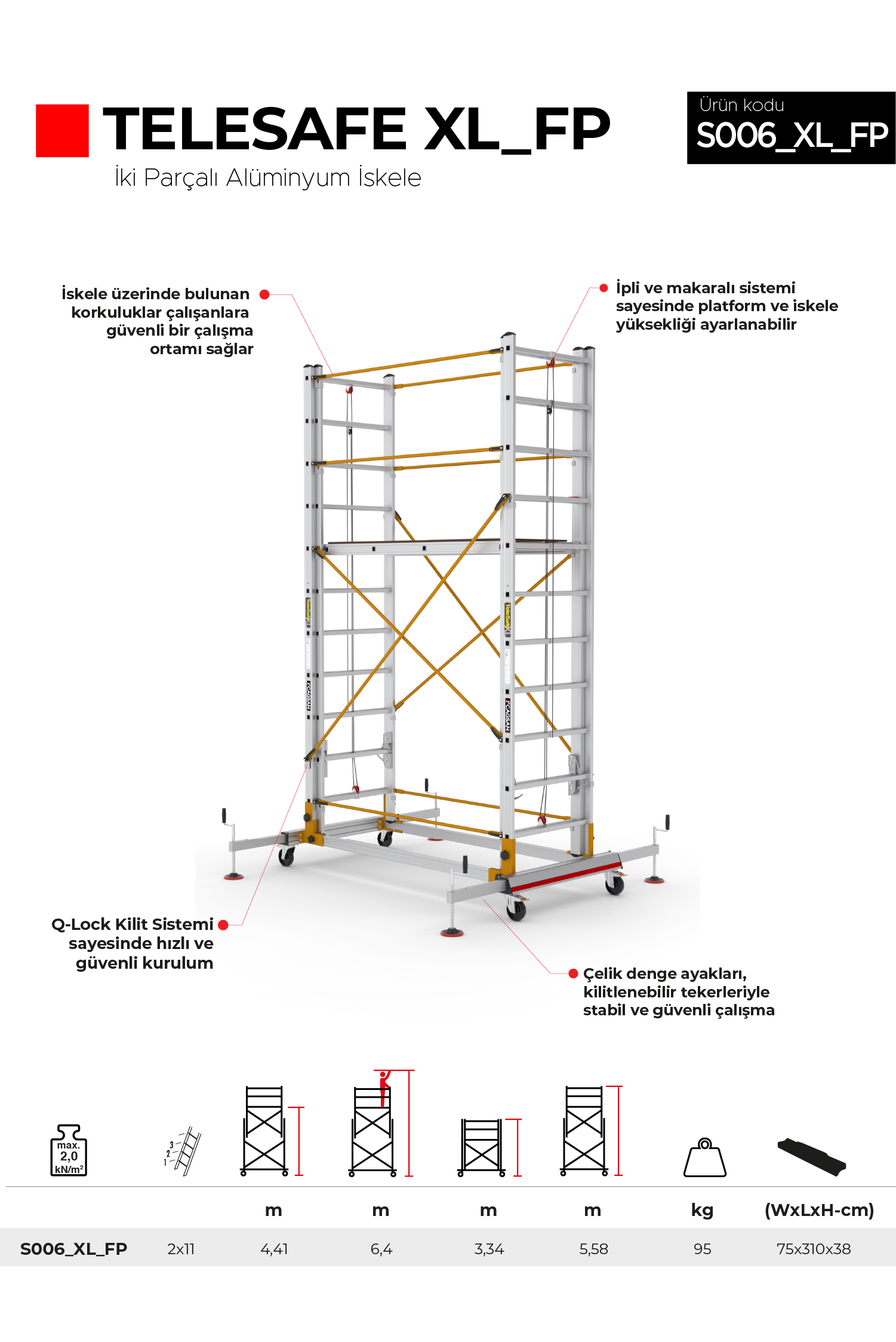 TeleSafe XL_FP, profesyonel kullanım için tasarlanmış, yüksek güvenlikli ve kolay taşınabilir iki parçalı alüminyum iskeledir. Yeni Q-Lock kilit sistemi sayesinde hızlı ve güvenli kurulum yapılabilir. İpli-makaralı mekanizmasıyla platform yüksekliği her 28 cm’de bir ayarlanabilir, bu da farklı yüksekliklerde esnek çalışma imkânı sunar. Sağlam alüminyum gövde ve çelik denge ayakları, sarsıntısız ve dengeli bir kullanım deneyimi oluşturur. Kilitlenebilir tekerlekleri sayesinde hem hareket kolaylığı hem de güvenli sabitleme avantajı sağlar. İçten açılan platform kapağı ve 110 cm korkuluk yüksekliği, iş güvenliğini üst seviyeye taşır. 2 kN/m² taşıma kapasitesiyle temizlik, bakım, montaj ve inşaat işlerinde güvenle kullanılabilir. TeleSafe XL_FP, dayanıklılığı, hızlı kurulumu ve profesyonel güvenlik standartlarıyla işlerinizi hızlandıran güvenilir bir iskele çözümüdür.