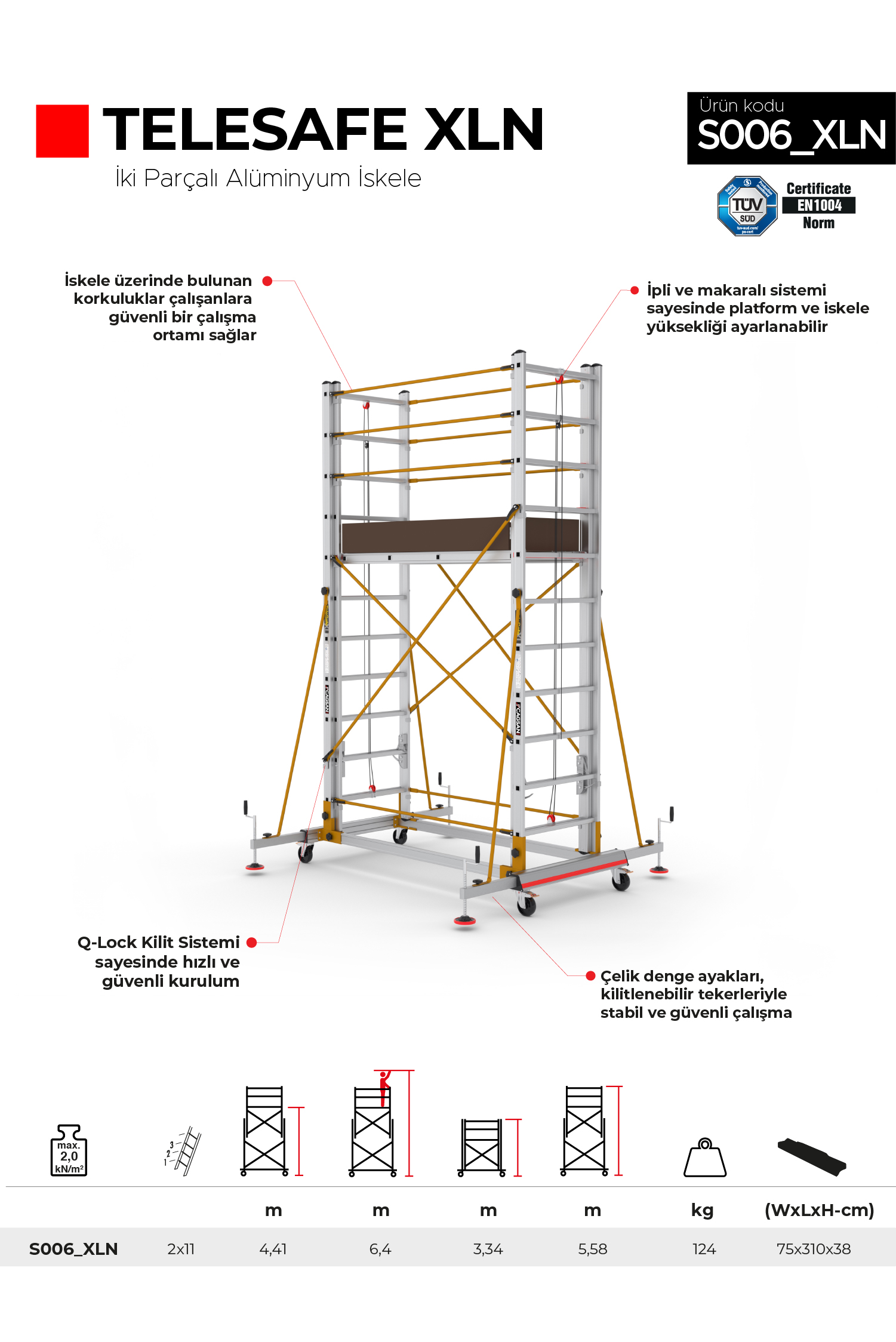 TeleSafe XLN İki Parçalı Alüminyum İskele, EN 1004-1:2020 standardına uygun ve TÜV-SÜD kalite belgeli profesyonel bir mobil iskele sistemidir. Özel mafsal yapısı sayesinde yüksekliği kolayca ayarlanabilir ve farklı çalışma alanlarına uyum sağlar. Q-Lock kilit sistemiyle hızlı ve güvenli kurulum yapılabilir. Sağlam alüminyum konstrüksiyon ve çelik denge ayakları, güvenli ve dayanıklı bir yapı oluşturur. Kilitlenebilir tekerlekler sallanmayı minimuma indirir ve stabil çalışma ortamı sağlar. 2 kN/m² taşıma kapasitesi sayesinde ağır ekipmanlarla güvenli kullanım imkanı sunar. TeleSafe XLN, taşınabilir yapısı, kolay kurulumu ve uzun ömürlü malzeme kalitesiyle profesyoneller için güvenli, pratik ve yüksek performanslı bir çözüm sunar.