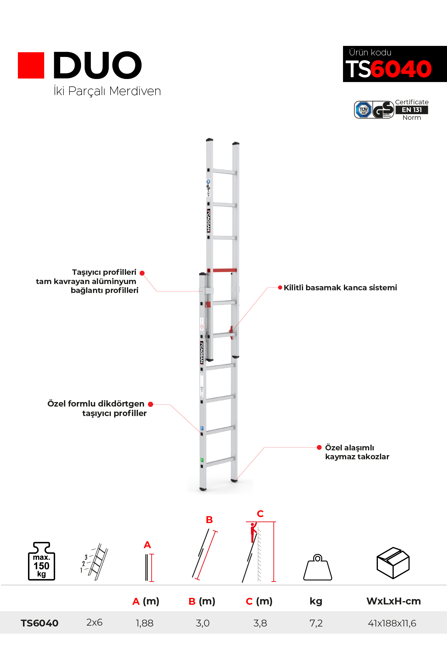 Çağsan 2x6 Basamaklı Duo - İki Parçalı Alüminyum Merdiven Ts6040 2x6 Basamak