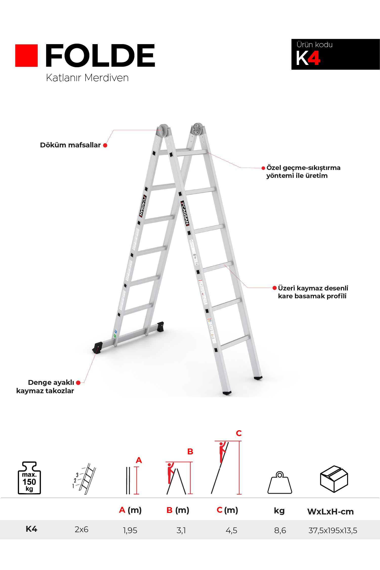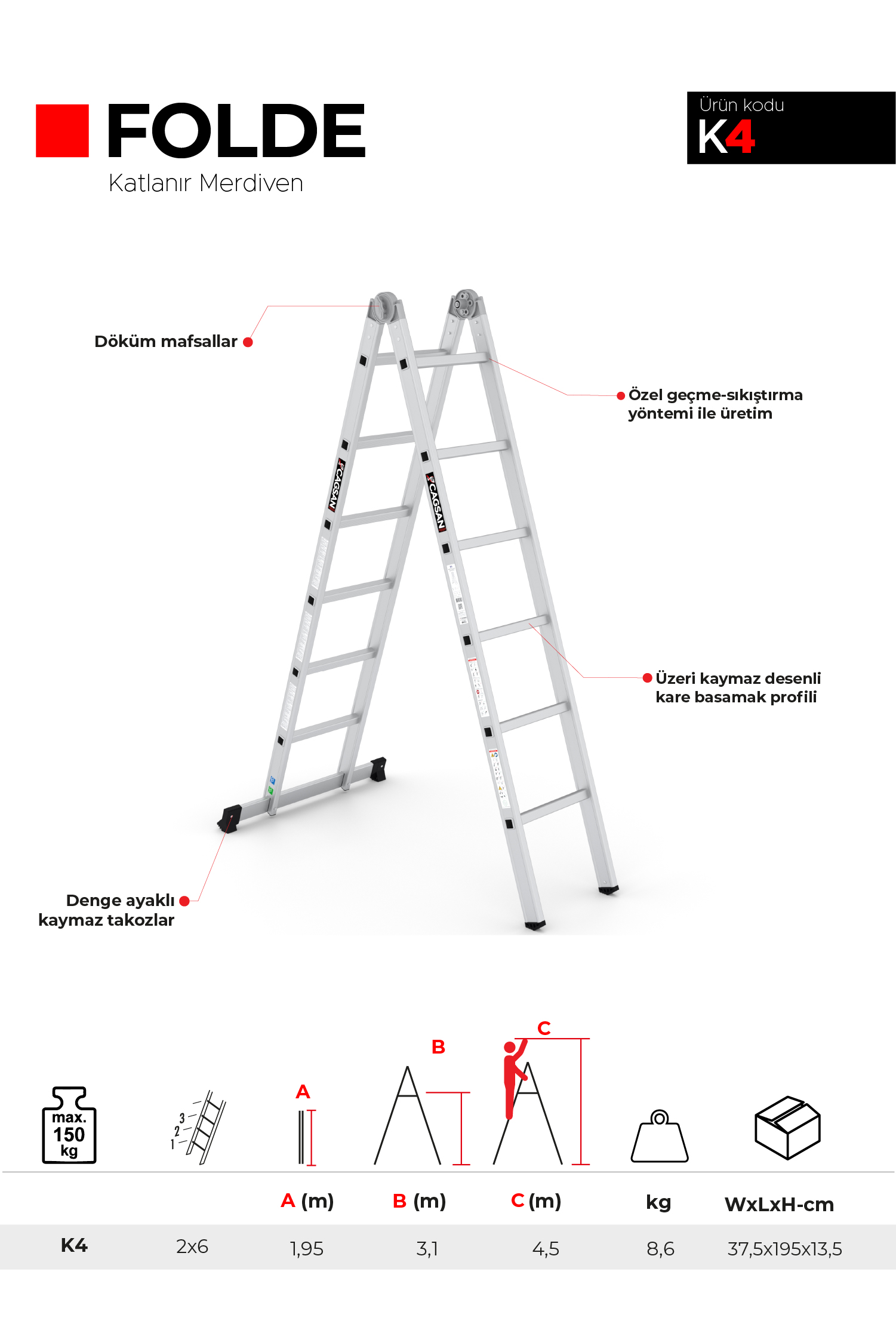 FOLDE Katlanır Merdivenler, geniş denge ayağı, kaymaz takozları ve kilitli mafsalıyla güvenli kullanım sağlar. Üç farklı kombinasyonda kullanılabilen çok yönlü tasarımıyla ev, iş yeri ve atölyelerde ideal çözümdür. Katlanabilir yapısı sayesinde kolay taşınır, yerden tasarruf sağlar. Sağlam profilleri ve kaliteli malzemesiyle uzun ömürlü, pratik ve güvenli bir kullanım sunar.
