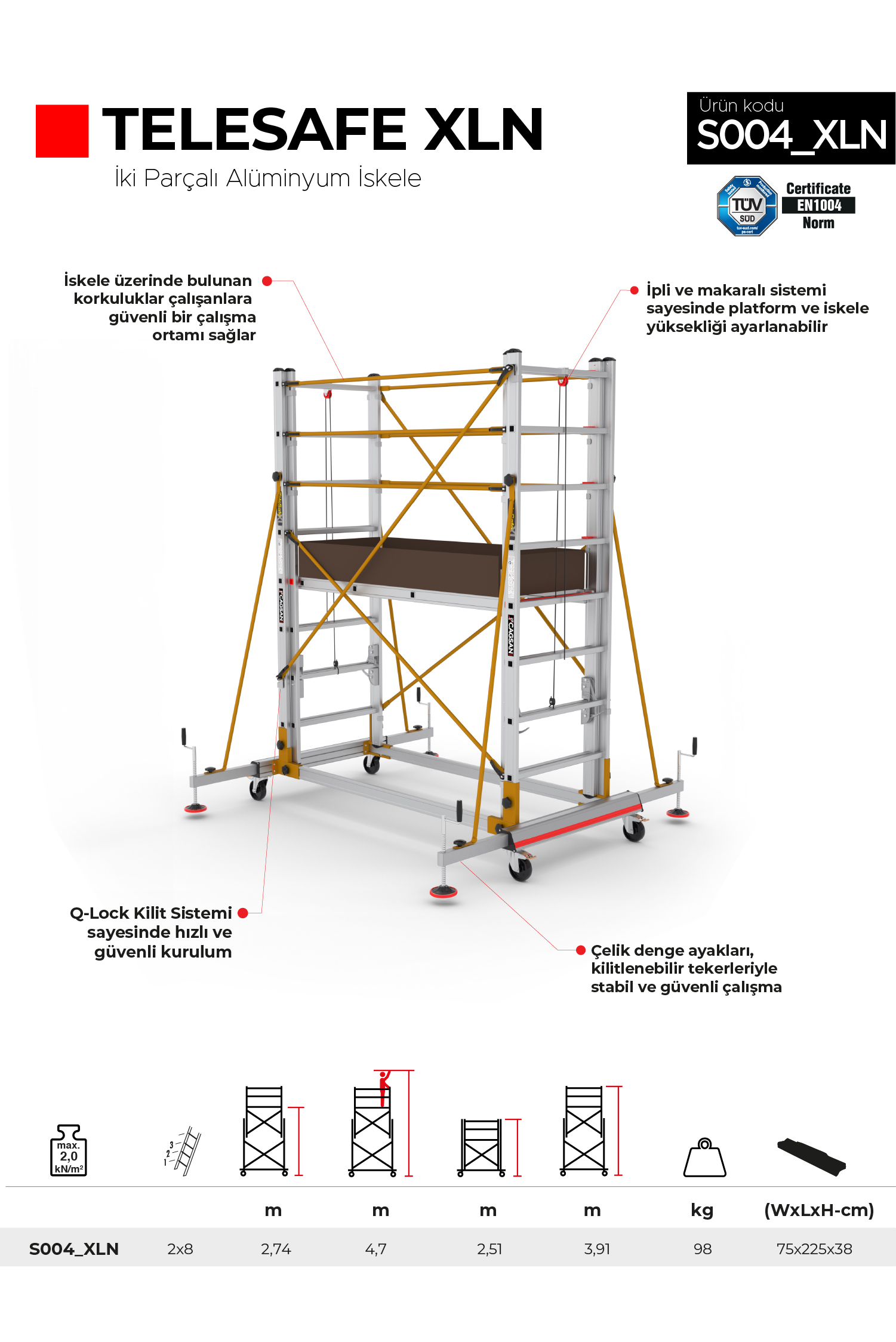 TeleSafe XLN İki Parçalı Alüminyum İskele, EN 1004-1:2020 standardına uygun ve TÜV-SÜD kalite belgeli profesyonel bir mobil iskele sistemidir. Özel mafsal yapısı sayesinde yüksekliği kolayca ayarlanabilir ve farklı çalışma alanlarına uyum sağlar. Q-Lock kilit sistemiyle hızlı ve güvenli kurulum yapılabilir. Sağlam alüminyum konstrüksiyon ve çelik denge ayakları, güvenli ve dayanıklı bir yapı oluşturur. Kilitlenebilir tekerlekler sallanmayı minimuma indirir ve stabil çalışma ortamı sağlar. 2 kN/m² taşıma kapasitesi sayesinde ağır ekipmanlarla güvenli kullanım imkanı sunar. TeleSafe XLN, taşınabilir yapısı, kolay kurulumu ve uzun ömürlü malzeme kalitesiyle profesyoneller için güvenli, pratik ve yüksek performanslı bir çözüm sunar.