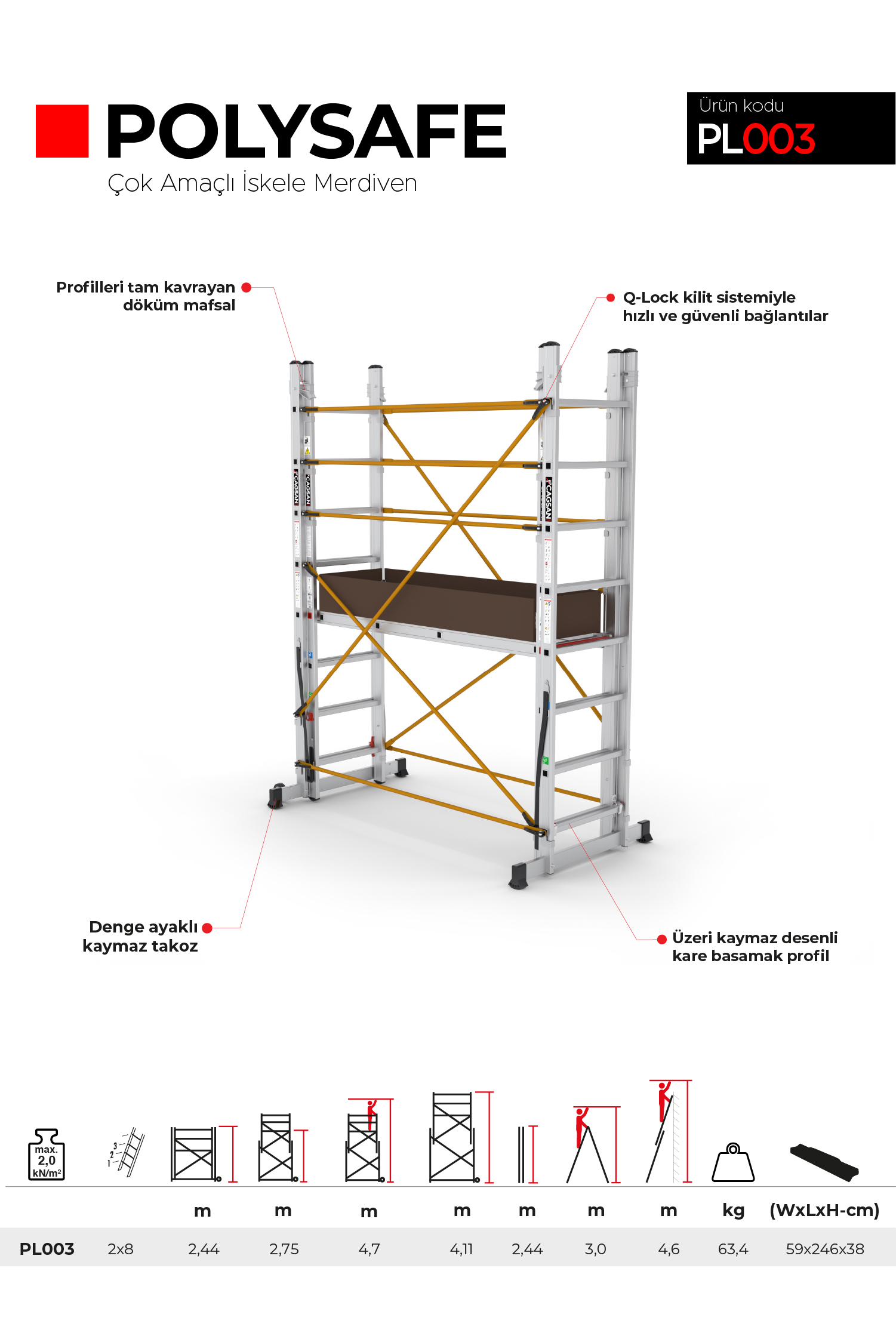 POLYSAFE Çok Amaçlı Alüminyum İskele Merdiven, mobil iskele, PTT tipi ve A tipi merdiven olarak kullanılabilen çok yönlü bir üründür. Platform yüksekliği basamaklara göre kolayca ayarlanabilir. Kaliteli alüminyum profil ve dayanıklı bağlantılar sayesinde hafif, sağlam ve uzun ömürlüdür. Stoplama pimi, döküm mafsallar ve tekmelik ile güvenli ve ergonomik bir çalışma ortamı sağlar. Q-Lock kilit sistemi ve sağlam tekerlekler sayesinde kurulumu ve taşınması kolaydır. Geniş denge ayakları platformun sallanmasını önler ve güvenli bir kullanım sunar. Platform 2 kN/m² yük taşıyabilir. Tek ürünle çok iş yapılabilmesi sayesinde maliyet ve ekipman tasarrufu sağlar. İnşaat, bakım-onarım, montaj ve profesyonel iş sahalarında verimli ve güvenli kullanım için idealdir.