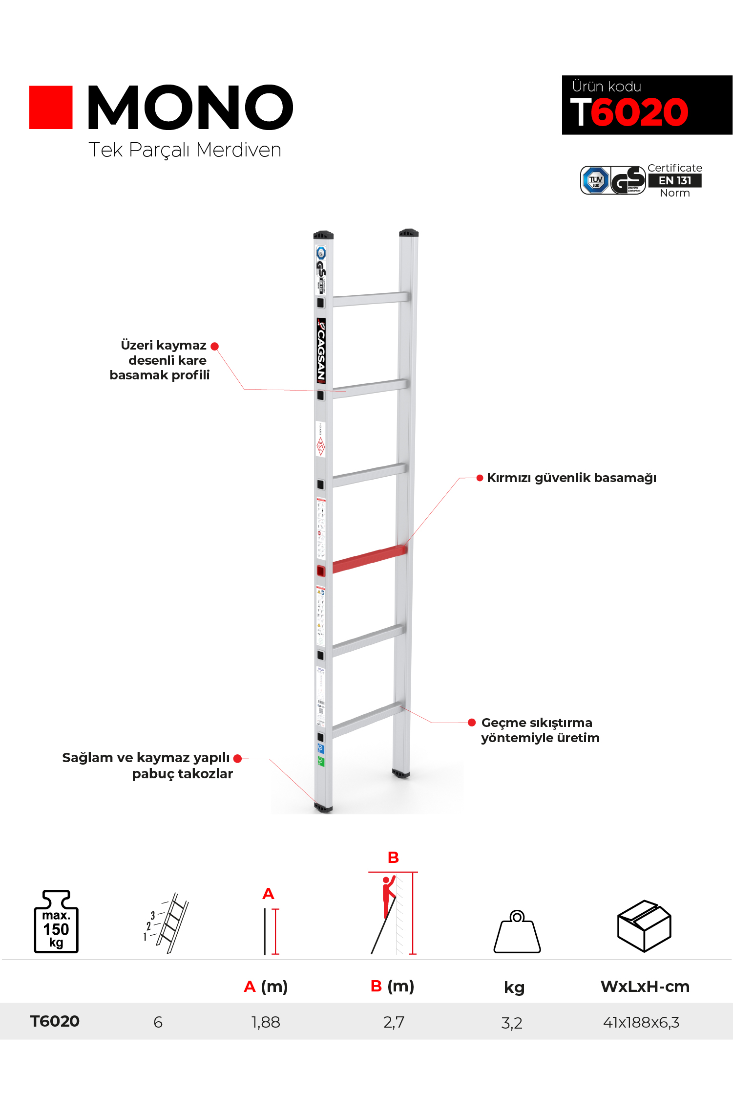MONO Tek Parçalı Alüminyum Merdivenler, profesyonel işler ve ev kullanımı için pratik ve güvenli bir çözümdür. Hafif alüminyum yapısı sayesinde kolay taşınır, sağlam profilleri ve kaymaz basamaklarıyla uzun ömürlü kullanım sunar. Kırmızı güvenlik basamağı maksimum güvenliği işaret eder.MONO merdivenler, TÜV-SÜD ve TSE EN 131 belgeleriyle kalite ve güvence sağlar.