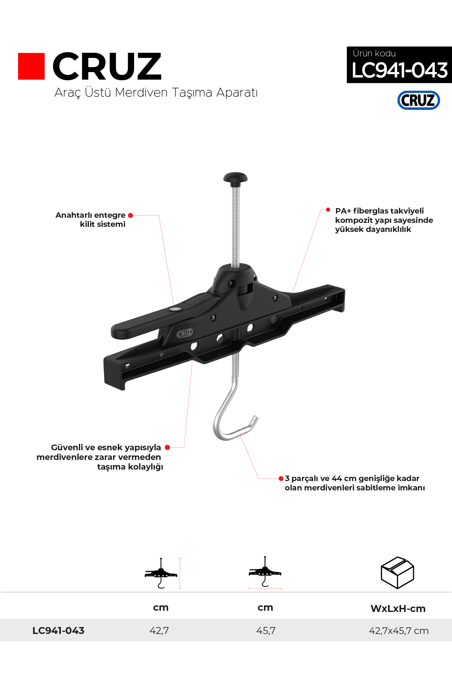 CRUZ - Araç Üstü Merdiven Taşıma Aparatı, merdiveninizi güvenle taşımak için mükemmel bir çözümdür. Yerden kolaylıkla erişebileceğiniz kullanımı, hızlıca monte edilerek pratiklik sunar. Güvenli taşımayı ve pratikliği ön planda tutan CRUZ, güçlendirilmiş fiber yapısı ve anahtarlı emniyet kilidiyle koruma sağlar. Bu sayede merdiveninizi güvenle taşıyabilir ve endişe duymadan kullanabilirsiniz. Kutu içeriği 2 adet Merdiven Taşıma Aparatı, 2 adet anahtar içermektedir. Hızlı montaj süresi, güçlendirilmiş fiber yapısı, anahtarlı emniyet kilidi, 44 cm. paslanmaz kelepçe ve 7 cm kanca aralığı gibi özelliklerle güvenli, hızlı, pratik ve ergonomik bir deneyim sunar.
