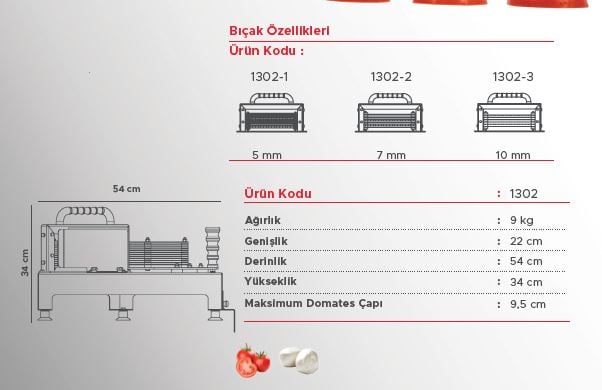 Domates ve mozzarella gibi hassas ürünlerde hızlı, standart ve pratik sonuçlar sağlayan bu model, sebze doğrama makineleri kategorisinin öne çıkan ürünlerinden biridir. Profesyonel mutfaklarda kaliteyi ve hız kazandıran güvenilir bir tercihtir.