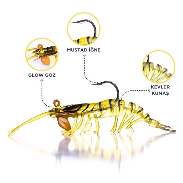 Avcı balıkların dikkatini çekecek özel glow gözler, keskin Mustad kancalar ve Kevlar bez ile güçlendirilmiş kuyruk aksiyonu sayesinde hem estetik hem de işlevsel üstünlüğü garanti ediyor. Hem profesyonel hem de amatör balıkçılar için ideal bir seçim olan bu silikon karides, avcılık deneyimlerinize fark katacak.