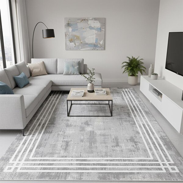 Gri zemin üzerine uygulanan yumuşak geçişli dokular ve beyaz çerçeve çizgileriyle tasarlanan bu modern dijital baskılı halı, minimalist ve çağdaş dekorasyon tarzlarını tamamlayan zarif bir modeldir. Hem sade hem şık görünümü sayesinde mekâna ferahlık ve düzen hissi kazandırır. Yüksek çözünürlüklü dijital baskı teknolojisi, desenlerin uzun yıllar boyunca net ve canlı kalmasını sağlar. Alt kısımda yer alan kaymaz taban, halının zeminde sabit durmasını sağlayarak güvenli kullanım sunar. Bu modern ve sade tasarımlı halı; Salon, Yatak odası, Çalışma odası, Ofis, Antre ve koridor gibi pek çok yaşam alanına kolaylıkla uyum sağlar. Kolay temizlenebilir yüzeyi, yumuşak dokusu ve hafif yapısıyla hem kullanışlı hem estetik bir dekorasyon parçasıdır. Minimal ve modern bir görünüm isteyenler için ideal bir seçimdir.