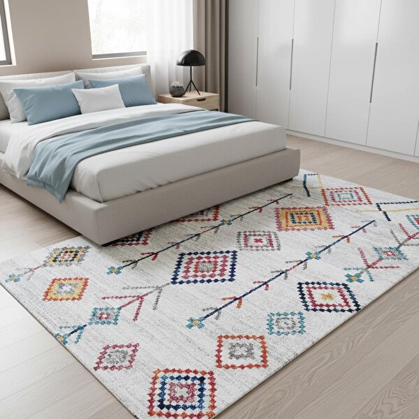 Krem zemin üzerine işlenmiş canlı ve çok renkli etnik motiflerle tasarlanan bu dijital baskılı halı, enerjik ve modern boho dekorasyon tarzlarının vazgeçilmez tamamlayıcısıdır. Elmas biçimli geometrik desenler ve ince çizgilerle oluşturulmuş detaylar, halıya hareketli ve estetik bir görünüm kazandırır. Yüksek çözünürlüklü dijital baskı teknolojisi, renklerin canlılığını ve desenlerin netliğini uzun süre korur. Halının alt kısmında yer alan kaymaz taban, zemin üzerinde sabit durmasını sağlayarak güvenli kullanım sunar. Bu dekoratif halı; Salon, Genç odası, Çalışma odası, Oturma odası, Koridor ve antre gibi yaşam alanlarında rahatlıkla kullanılabilir. Kolay temizlenebilir yapısı, yumuşak dokusu ve hafifliği sayesinde hem günlük kullanımda pratiklik sağlar hem de evinize modern ve renkli bir hava katar. Bohem tarzı sevenler için ideal bir seçimdir.