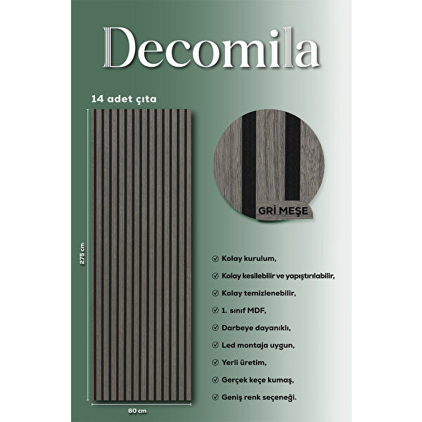 Ürün Özellikleri * ✅ Malzeme: Yüksek yoğunluklu birinci sınıf MDF * 🎨 Renk Seçenekleri: 23 farklı  renk ve doku yelpazesi * 🔇 Ses Performansı: Yankıyı azaltır, akustik konfor sağlar * 🛠️ Montaj: Kolay kurulum, uzun ömürlü kullanım * 🧱 Kullanım Alanları: Ofis, stüdyo, toplantı salonu, otel ve yaşam alanları * 👷 Uygulama Hizmeti: Toplu alımlarda İstanbul içi profesyonel uygulama * 🧰 İşçilik: Uzman ustalarımızın titiz ve özenli montajı Avantajları * Şık ve modern görünüm * Yüksek kalite MDF yapısı * Zengin renk ve model alternatifleri * Uzun ömürlü ve kolay temizlenebilir yüzey * Ses konforu sağlayan etkili yalıtım NASIL MONTAJ YAPABİLİRİM? Yapıştırıcı (silikon,mastik,montaj yapıştırıcısı) yardımı ile kolaylıkla yapıştırılabilir. Uygulama yapılmadan önce uygulayacağınız zemini tozdan, kirden tamamen temizlemeniz gerekmektedir. Uygulanacak alanda bozuk ve yapıştırmaya uygun olmayan yerler varsa tamir edilmelidir. Ürünü gönye makinesi, dekupaj, kıl testere yardımıyla belirleyeceğiniz yerlerden kesebilirsiniz. Ürünün arka kısmına fındık büyüklüğünde silikonize mastik sıkarak uygulayacağınız alana yapıştırabilirsiniz. Gerek duyulması halinde kompresör çivitabancası ile belirli yerlere çivi çakarak uygulamasını yapabilirsiniz. Açıklama Decomila akustik paneller, yaşam alanlarınızı sessiz, konforlu ve estetik bir atmosfere dönüştürür. Modern tasarımı, dayanıklılığı ve titiz işçiliğiyle iç mekânlarınıza zarafet katar.