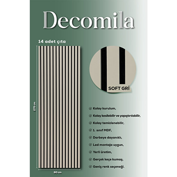Ürün Özellikleri * ✅ Malzeme: Yüksek yoğunluklu birinci sınıf MDF * 🎨 Renk Seçenekleri: 23 farklı  renk ve doku yelpazesi * 🔇 Ses Performansı: Yankıyı azaltır, akustik konfor sağlar * 🛠️ Montaj: Kolay kurulum, uzun ömürlü kullanım * 🧱 Kullanım Alanları: Ofis, stüdyo, toplantı salonu, otel ve yaşam alanları * 👷 Uygulama Hizmeti: Toplu alımlarda İstanbul içi profesyonel uygulama * 🧰 İşçilik: Uzman ustalarımızın titiz ve özenli montajı Avantajları * Şık ve modern görünüm * Yüksek kalite MDF yapısı * Zengin renk ve model alternatifleri * Uzun ömürlü ve kolay temizlenebilir yüzey * Ses konforu sağlayan etkili yalıtım NASIL MONTAJ YAPABİLİRİM? Yapıştırıcı (silikon,mastik,montaj yapıştırıcısı) yardımı ile kolaylıkla yapıştırılabilir. Uygulama yapılmadan önce uygulayacağınız zemini tozdan, kirden tamamen temizlemeniz gerekmektedir. Uygulanacak alanda bozuk ve yapıştırmaya uygun olmayan yerler varsa tamir edilmelidir. Ürünü gönye makinesi, dekupaj, kıl testere yardımıyla belirleyeceğiniz yerlerden kesebilirsiniz. Ürünün arka kısmına fındık büyüklüğünde silikonize mastik sıkarak uygulayacağınız alana yapıştırabilirsiniz. Gerek duyulması halinde kompresör çivitabancası ile belirli yerlere çivi çakarak uygulamasını yapabilirsiniz. Açıklama Decomila akustik paneller, yaşam alanlarınızı sessiz, konforlu ve estetik bir atmosfere dönüştürür. Modern tasarımı, dayanıklılığı ve titiz işçiliğiyle iç mekânlarınıza zarafet katar.