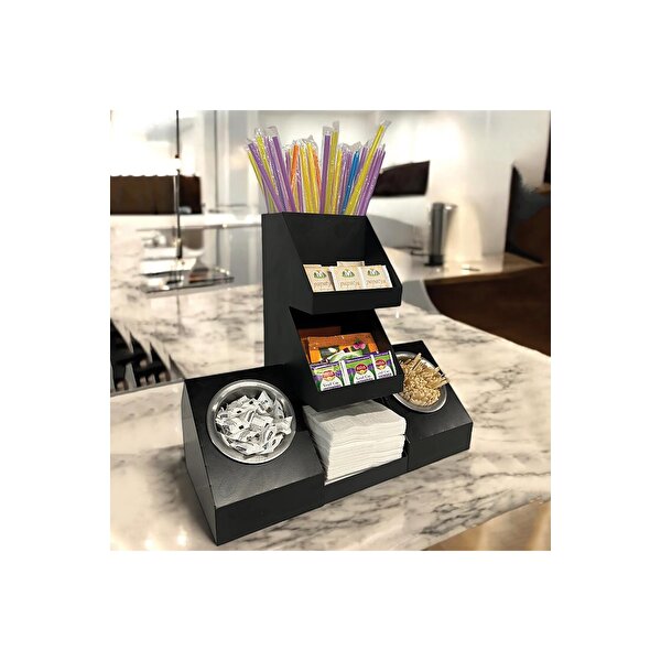 Alt bölümde, tam ortada peçete konulabilen özel bölme, iki yanında ise şeker, kürdan veya çeşitli çubuklarınızı muhafaza edebileceğiniz metal kaseler mevcut. Pratik kullanım özellikleri sayesinde hem ev içi hem de iş yerleri için oldukça kullanışlıdır.