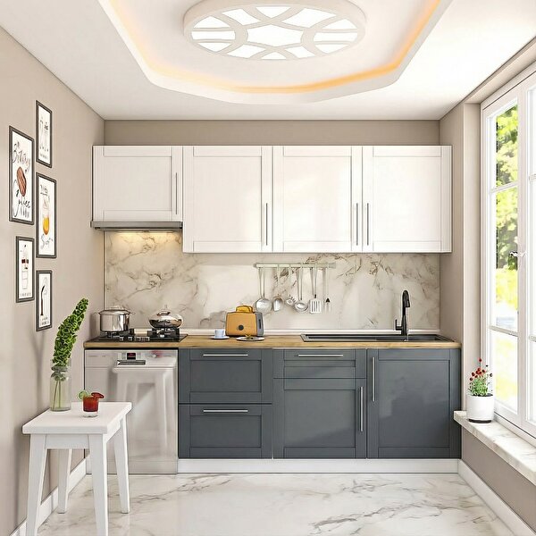 Renk Detayı Üst modüller beyaz, alt modüller antrasit, tezgah meşe rengidir. Kapaklar membrandır.