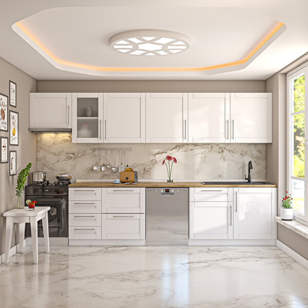 Dekorex Pia Beyaz Serisi 345 Cm Aspiratör Ve Çekmece Modüllü Meşe Tezgahlı Hazır Mutfak Pb-345asp-bc-mt 345 cm