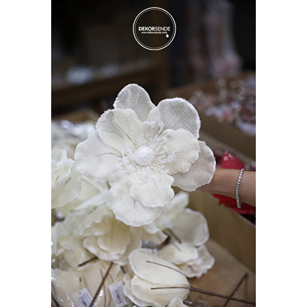 Dekorsende markamızın özel tasarım yılbaşı koleksiyonundan, Noel yıldızı olarak da bilinen bu zarif ve pırıltılı Poinsettia çiçek dalı ile yılbaşı dekorasyonunuza ışıltı katın! 30 cm uzunluğundaki bu süsleme, canlı beyaz rengi ve üzerindeki gümüş renkli parıltılı simlerle adeta bir kış masalı atmosferi yaratır. Çubuklu yapısı sayesinde yılbaşı ağacınıza, çelenklerinize, masa aranjmanlarınıza veya vazolarınıza kolayca yerleştirilebilir.