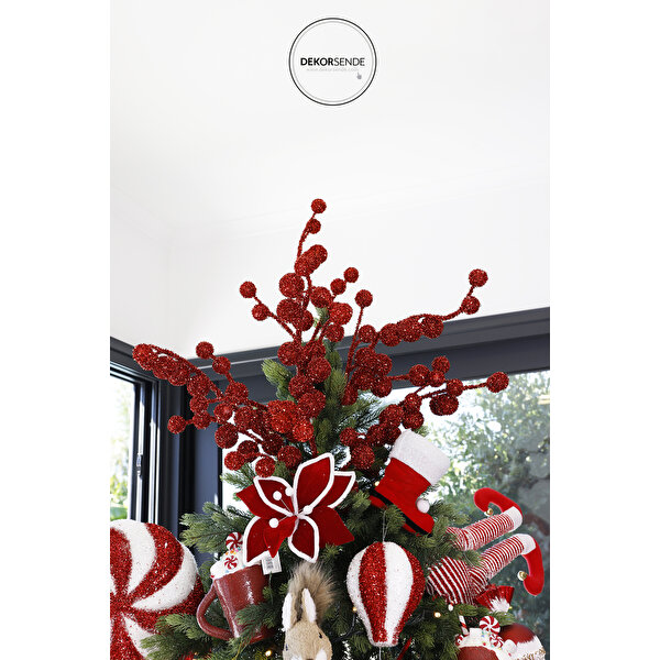 Dekorsende markamızın yılbaşı koleksiyonunun göz alıcı parçalarından biri olan bu parlak topçuk dal süsleme ile yılbaşı dekorasyonunuza ışıltı katın! 55 cm uzunluğundaki bu süsleme, canlı kırmızı rengi ve üzerindeki pırıltılı simlerle adeta ışık saçar. Esnek yapısı sayesinde yılbaşı ağacınızın dallarına, çelenklerinize, masa aranjmanlarınıza veya vazolarınıza kolayca yerleştirilebilir.