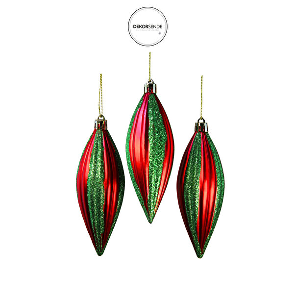 Yılbaşı Süsü 3'lü Set Lüks Simli Yaprak Formlu Kırmızı Yeşil 13 cm