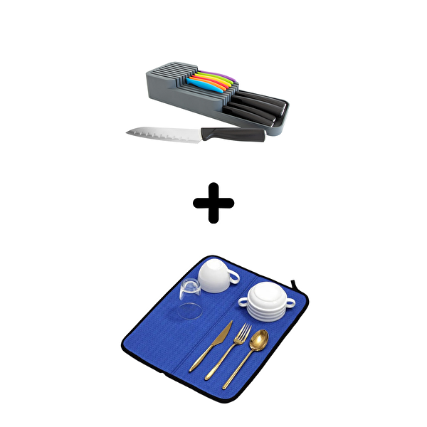 2 Sıra Bıçaklık + Bulaşık Kurutma Matı 2'li Mutfak Seti, Mavi
