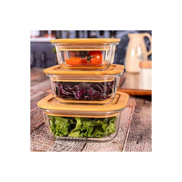 Bambu Kapaklı Vakumlu 3'lü Kare Cam Kase Saklama Kabı Seti