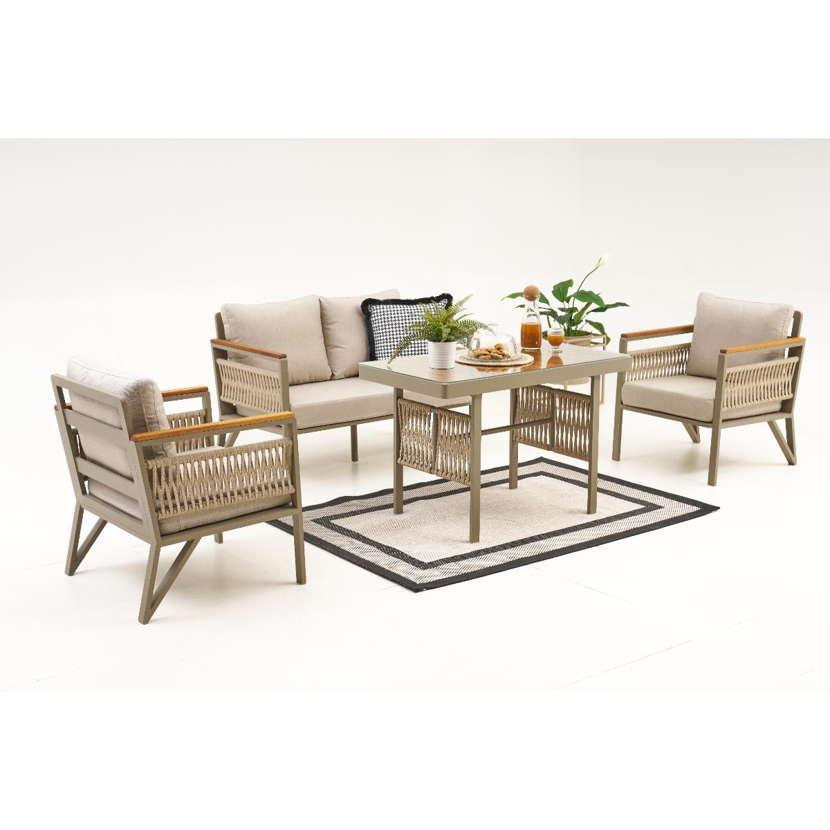 • Sağlam Gövde: %100 alüminyum, Birinci Sınıf İreko Ahşap, Dış Mekân İp Örgü, Konforlu Oturum: 32 DNS, Dayanıklılık: UV testlerinden geçirilmiş yüzey kaplaması