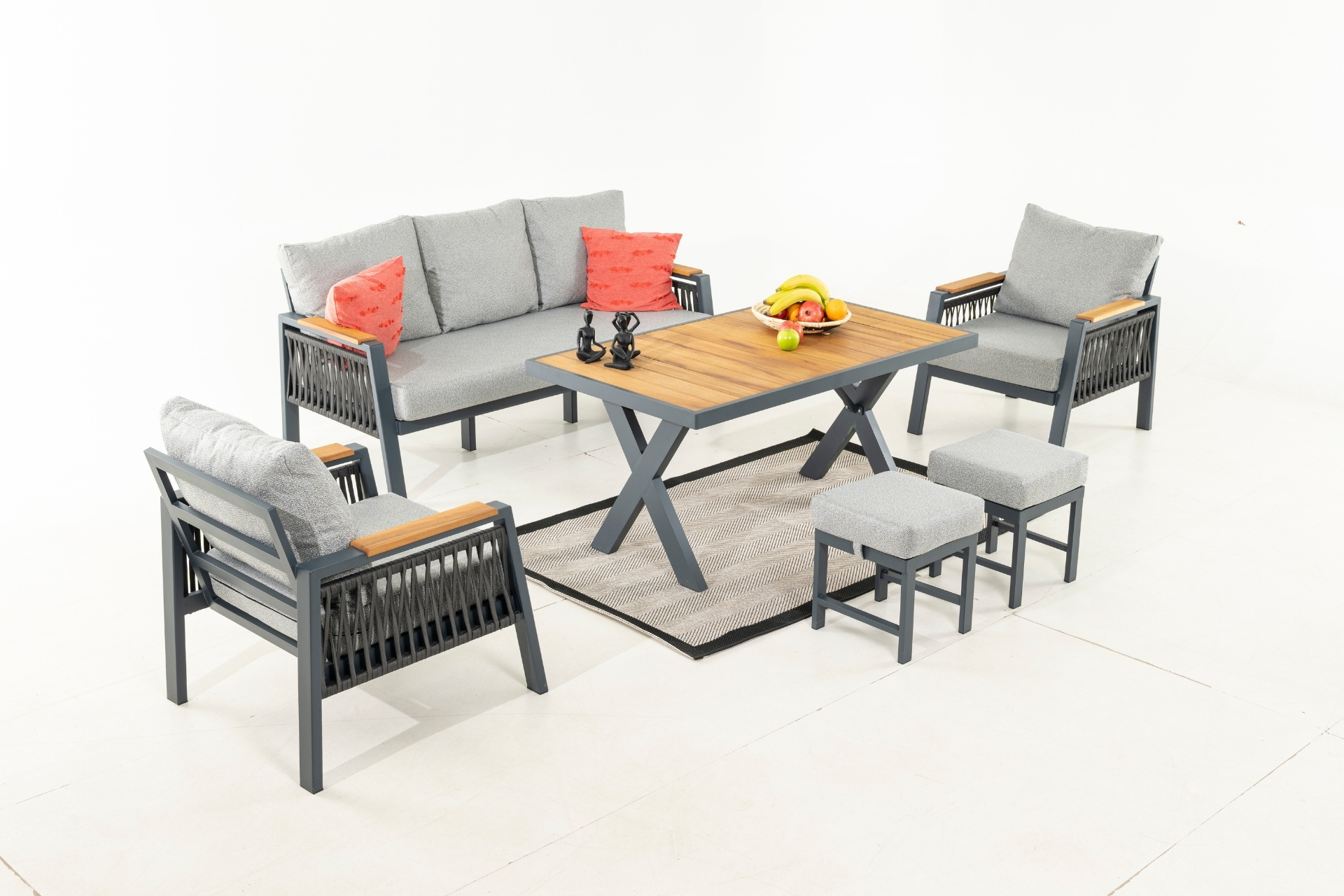 OCEAN BAHÇE BALKON OTURMA GRUBU 3+1+1+MASA+2 PUF  Alüminyum İskelet  İreko ahşap  32 DNS soft sünger  İspanyol Etisilk kumaş  Ürünümüz bir adet üçlü, iki adet tekli ve iroco masadan ve iki adet puftan oluşmaktadır. ÜRÜN ÖLÇÜLERİ ÜÇLÜ KOLTUK : 170x77x76 TEKLİ KOLTUK : 74x77x76 MASA : 80x140x66 PUF:35x35x35 cm OTURUM YÜKSEKLİĞİ 44 cm dir.