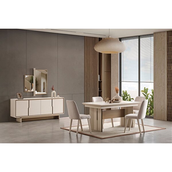 Takım İçeriği: Masa- 6 Sandalye -Konsol- Konsol Aynası Malzeme: Avrupa E1 Standartlarına uygun malzeme olan Yonga Levha Masa Fonksiyonu: Açılır Konsol Fonksiyonu: Kapaklı / Aynalı Ayak Tipi: Mika Ürün demonte olarak gönderilir ve kurulum müşteriye aittir. Müşteri tercihine göre ürün kurulumu tarafımızca gerçekleştirilebilir. Teslimat: Tüm ürünler titizlikle hazırlanmakta ve anlaşmalı lojistik firmalarıyla gönderilmektedir. Türkiye’nin her yerine teslimat yapılmaktadır. Garanti: 2 Yıl Masa: Kapalı (G: 150 D: 90 Y: 78) Açık (G: 190 D: 90 Y: 78) Sandalye: (G: 55 D: 50 Y: 84) Konsol: (G: 190 D: 41 Y: 78) Konsol Aynası: (G: 32 D: 2 Y: 100)