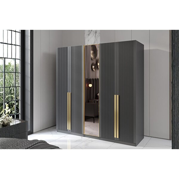 Malzeme: Yüksek mukavemet özelliğine sahip MDF Gardırop Fonksiyonu: 5 Kapılı / Aynalı Ayak Tipi: Ayaksız Ürün demonte olarak gönderilir ve kurulum müşteriye aittir. Müşteri tercihine göre ürün kurulumu tarafımızca gerçekleştirilebilir. Teslimat: Tüm ürünler titizlikle hazırlanmakta ve anlaşmalı lojistik firmalarıyla gönderilmektedir. Türkiye’nin her yerine teslimat yapılmaktadır. Garanti: 2 Yıl Gardırop: (G: 205 D: 53 Y: 214)