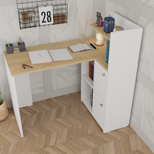 Durusilya Mobilya L Çalışma Masası Kitaplıklı Dolaplı Meşe Beyaz