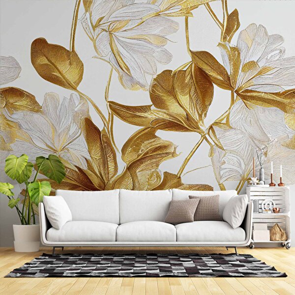 Duvarkagidibaski 3 Boyutlu Beyaz Altın Çiçek Desenli Duvar Kağıdı - Dkm894025 200x240 cm