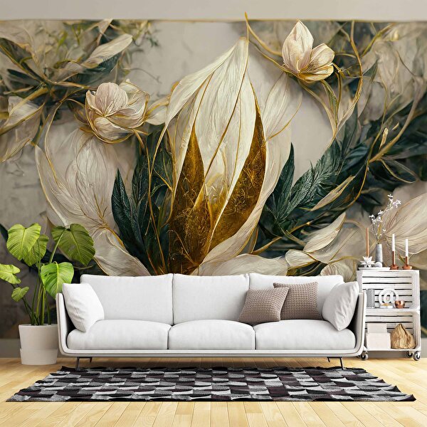 Duvarkagidibaski 3 Boyutlu Beyaz Çiçek Ve Altın Görünümlü Duvar Kağıdı - Dkm978051 325x260 cm